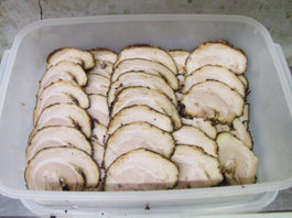 | 生地は5・6時間ねかせて熟成させます。 切り出して乾燥させないよう少量の粉をからめて袋詰めに します。袋に入れる直前に軽く手もみをして、しなやかさ と粘りをもたせています。さらに一晩ねかせます。 茹でてからものびにくい麺はこのようにしてつくられてい ます。加水の量の加減などで、透明感のあるツルツル麺が できます。 |